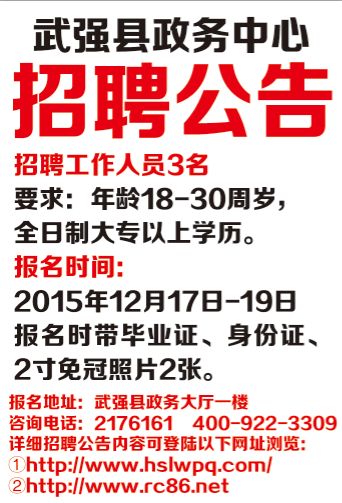 根據(jù)用工需求,現(xiàn)委托衡水天翔勞務(wù)派遣有限公司代武強縣政務(wù)服務(wù)中心招聘派遣用工3名。擬面向社會公開招聘工作人員,現(xiàn)將有關(guān)事宜公告如下: